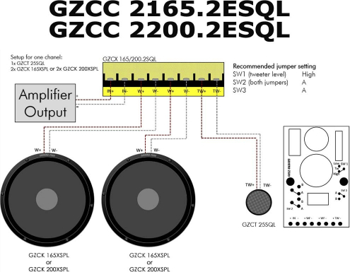 - 2-way passive separate system - DUAL 6.5″ woofers ( GZCK 165XSPL ) - 1″ tweeters ( GZCT 25SQL ) - passive crossovers ( GZCX 165/200.2SQL ) - frequency response 50 - 20 000 Hz - cutoff frequency 4500 Hz ( 12 dB/oct ) - sensitivity 94 dB - power handling 160 W RMS / 300 W Peak - woofer mounting depth 72 mm - woofer mounting diameter 145 mm.