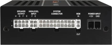Technical data Output power RMS / max. - @ 4 OhmsChannels A - F: 6 x 65 Watts - @ 2 Ohms- - @ 1 Ohm- - bridged @ 4 Ohms- - bridged @ 2 Ohms- - Subwoofer output @ 4 OhmsKanal G - H: 2 x 90 Watts - Subwoofer output @ 2 OhmsKanal G - H: 2 x 160 Watts Amplifier technologyClass GD Inputs6 x Highlevel speaker input 1 x Optical SPDIF (12 - 96 kHz) 1 x MEC 1 x Remote In Input sensitivity2.8 - 11 Volts Input impedance RCA / Cinch- Input impedance highlevel9 - 33 Ohms with ADEP.3 Outputs8 x Speaker output 1 x RCA / Cinch 1 x Remote Out Output voltage RCA / Cinch3 Volts RMS Frequency response10 Hz - 22,000 Hz DSP resolution64 Bit DSP power295 MHz (1.2 billion MAC operations/second) Sampling rate48 kHz DSP typeAudio signal processor Signal convertersA/D: BurrBrown D/A: BurrBrown Signal-to-noise ratio digital input106 dB (A-weighted) Signal-to-noise ratio analog input104 dB (A-weighted) Distortion (THD) 0.03 % Damping factor 100 Operating voltage10.5 - 17 Volts (max. 5 sec. down to 6 Volts) Power ratingDC 12 V ⎓ 40 A max. Idle current380 mA Max. remote output current500 mA Fuse2 x 25 A LP-Mini-fuse (APS) Additional featuresClass GD technology with dynamically controlled power supply, 32 Bit CoProcessor, ADEP.3 circuit, Start-Stop capability, Smart Control Port, USB, MEC slot, Auto Remote switch, galvanically isolated Line Out Dimensions (H x W x D)46 x 130 x 153 mm / 1.81 x 5.12 x 6.02″