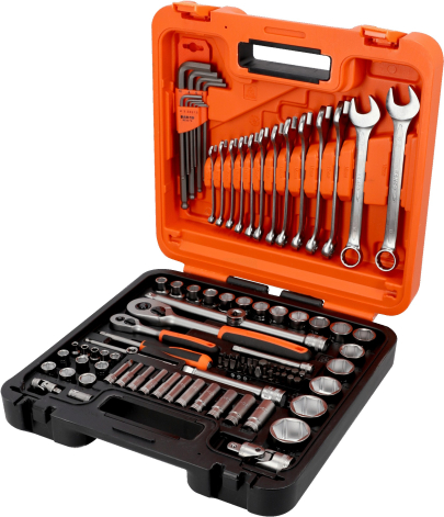 | 12 gabali 1/4” sešst. muciņas 4, 4,5, 5, 5,5, 6, 7, 8, 9, 10, 11, 12 un 13 mm 10 gab. 1/4" sešst. dziļās muciņas, 4, 5, 6, 7, 8, 9, 10, 11, 12 un 13 mm 13 gabali 1/2” sešst. muciņas 10, 11, 12, 13, 14, 15, 17, 19, 22, 24, 27, 30 un 32 mm 2 gab. 1/4" roktura pagarinātājs, 50 mm/2" un 100 mm/4" 1 gab. 1/4" bīdāms T rokturis 1 gab. 1/4" universālais savienojums 1 gab. 1/4" uzgaļu turētājs 1 gab. 1/4" uzgaļu adapters 1 gab. 1/4” sprūda skrūvgriezis ar divkomponentu rokturi 1 gab. 1/4" magnētiskais adapters 5 gab. 1/4" Phillips uzgaļi, PH0, PH1, PH2, PH3 un PH4 3 gab. 1/4" uzgaļi ar reni: 4, 5,5 un 7 mm 3 gab. 1/4" Pozidriv uzgaļi: PZ1, PZ2 un PZ3 6 gab. 1/4" sešst. muciņas, 3, 4, 5, 6, 8 un 10 mm 8 gab. 1/4” TORX® uzgaļi, T8, T10, T15, T20, T25, T27, T30 un T40 3 gab. 5/16" TORX® uzgaļi: T45, T50 un T55 2 gab. 1/2" roktura pagarinātājs, 5" un 10" 1 gab. 1/2" universālais savienojums 1 gab. 1/2" pagarinātās sešst. muciņas, 21 mm (13/16") 1 gab. 1/2" x 5/16" uzgaļu turētājs 1 gab. 1/2" T adapters 3 gab. sešst. L formas atslēgas: 1,5, 2 un 2,5 mm 1 gab. 1/4” sprūdrats, ātri atbrīvojams, 60 zobi/6° darbības leņķis 1 gab. 1/2” sprūdrats, ātri atbrīvojams, 60 zobi/6° darbības leņķis 4 gab. lokanās galvas uzgriežņu atslēgas, 8-9, 10-11, 12-13 un 14-15 mm 6 gab. kombinētās uzgriežņu atslēgas: 8, 10, 12, 13, 14 un 17 mm uz praktiska noņemama instrumentu plaukta 1 gab. noņemama 3 sekc. plastmasas kaste ar vāku Matēta apdare Augstas veiktspējas leģētais tērauds ateicoties Dynamic Drive™ profila ligzdām, mazāks stiprinājumu nodilums un bojājumi Ātrās kontaktligzdas atbrīvošanas poga uz sprūdrata Korpuss: augsta blīvuma polietilēns (HDPE) Standarti: ISO 1174 un DIN 3120 |