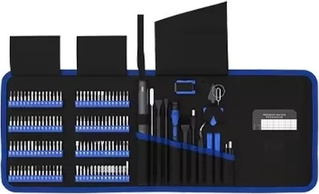 | Magnetic precision screwdriver set with electric screwdriver, 144 pcs, in a convenient case with accessories Features: This is a universal screwdriver set consisting of a professional 120-piece precision bit kit with an electric screwdriver handle, rechargeable via a USB Type-C port, along with an adjustable-length screwdriver handle and other electronics repair tools, all in a portable, durable fabric case. The bits are widely compatible with most household devices such as mobile phones, glasses, tablets, digital cameras, watches, computers, laptops, Xbox, Nintendo controllers, and more. The electric screwdriver handle features a USB Type-C charging port and an integrated 350mAh lithium-ion battery, providing up to 90 minutes of operation. Three built-in LED lights ensure comfortable work in low-light conditions. The rotation speeds (200rpm / 100rpm) can be switched by long-pressing the LED button; the faster speed is set by default. Electric torque adjustment from 0.12 to 0.35 N.m allows precise control of the screwdriver’s turning force for delicate work, protecting screws from over-tightening and damage. Also included is an ergonomic, adjustable-length, non-slip screwdriver handle for a secure grip and comfortable use. The bits are magnetic, ensuring they hold screws firmly and assist in their removal. Size markings allow you to quickly find the required bit, and the set includes spare pieces of the most commonly used bits. The screwdriver bits are made of chrome vanadium steel, ensuring ease of use and durability. The set also includes additional tools to support a wide range of repair tasks. A convenient 145x85 mm magnetic pad is included to keep screws organized during disassembly. The set includes: screwdriver bits, electric screwdriver handle in a plastic case, charging cable, adjustable screwdriver handle, black portable fabric tool case, curved tweezers, 4 plastic pry tools, 1 metal pry tool, cleaning brush, 8 plastic triangle opening picks (for separating device parts without scratching), 127 mm flexible screwdriver extension rod, rubber suction cup with ring (for screen removal), SIM card eject pin, magnetizer/demagnetizer tool, cleaning cloth, and a magnetic screw pad. Note: Charging wall adapter is sold separately. A 30cm USB Type-A to USB Type-C charging cable is included. Technical specifications: Bit quantity: 120. Material: CR-V chrome vanadium steel. Screwdriver handle length: (adjustable) 142~213 mm; (electric) 177 mm. Bit length: 28 mm. Electric torque: 0.12~0.35 N.m. Battery capacity: 350 mAh. Battery type: Li-ion, 10440. Charging port: USB Type-C. Charging voltage/current: 4.5V–6.5V / 0.35A. Max speed (no load): 200 rpm (consumption 100 mAh). Max speed (light load): 150 rpm (consumption 150–300 mAh). Charging time: >60 min (red indicator light). Battery life: 90 min operation, 90 days standby. Case dimensions: 245x150x50 mm. Tool case color: black, blue. Bit types: Phillips: (2x) PH0000, PH000, PH00, PH0, PH1, PH2. Flathead: (2x) 1.0, 1.3, 1.5, 2.0, 2.5, 3.0, 3.5, 4.0. Torx: (2x) T1, T2, T3, T4; (1x) T5, T6, T7, T8, T9, T10, T15, T20. Security Torx: (1x) T5H, T6H, T7H, T8H, T9H, T10H, T15H, T20H, T25H. Hex: (1x) H0.7, H0.9, H1.0, H2.0, H2.5, H3.0, H3.5, H4.0, H4.5, H5.0, H6.0; (2x) H1.3, H1.5. Y-Type: (2x) Y0.6, Y1.5; (1x) Y2.0, Y2.3, Y3.0. Pentalobe: (2x) 0.8, 1.2, 1.5, 2.0. Triangle: (1x) 2.0, 2.3, 2.7, 3.0. Square: (1x) SQ0, SQ1, SQ2. U-Type (Spanner): (1x) U2.3, U2.6, U8. Cross (2x) MID. Pozidriv: (2x) PZ000, PZ00, PZ0; (1x) PZ1, PZ2. Gamebit: (1x) G3.8, G4.5. Hex socket: (1x) 2.5, 3.0, 3.5, 4.0, 4.4, 5.0, 5.5. Cross: 1x ICS. SIM: 2x SIM. Flat Scraper: 1x FS. Pry Bar: 1x PB. Needle (conical): (1x) 0.1, 0.3. 1/4" to 4 mm driver adapter:1x 1/4-4. Warranty: 12 months. ![]() ![]() |
