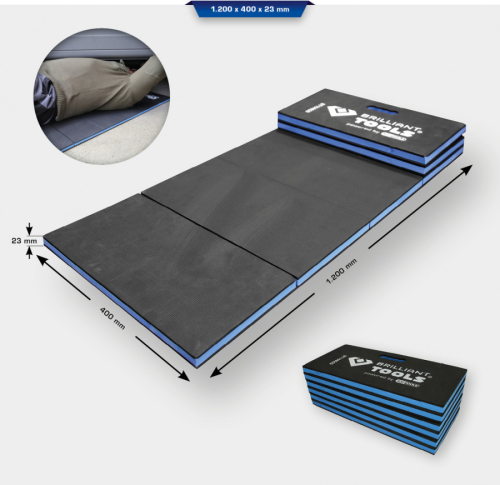 | Helps the mechanic to work easier and safer whilst working in the lower area of vehicles on a flat surface Moisture and dirt resistant Work clothes and knees remain dry, clean and don't cool down 3 layered padded construction from soft material The innovative folding mechanic protection matt, BT156920 from BRILLIANT TOOLS made of foam doesn't just protect your knees, but also your back. The 3-layer material ensures better heat retention and comfortable working. The folding protection mat with a length of 121 cm and a width of 42 cm offers you plenty of room. The protection mat is made of foam with a long service life used daily in the workshop. When folded, the mat is very compact with dimensions of 42 x 19.5 x 18.5 cm, allowing you to store it and save space. Properties Weight [g]: 1000 Packaging width, mm: 202 Packaging height, mm: 145 Packaging length, mm: 433 Size mm: 23,0 Width B: 400 Total length L in mm: 1200 | ||||||||||||||||||||||||||||||||