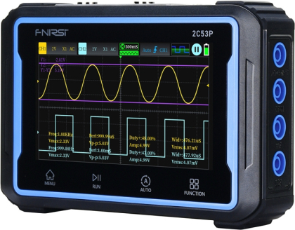 FNIRSI 2C53P 4.3" portable 3-in-1 touchscreen oscilloscope.The FNIRSI 2C53P is a portable oscilloscope that combines three functions: a two-channel oscilloscope, a digital multimeter and a DDS generator. The device offers extensive functionality in a compact form. It features a 4.3-inch IPS touchscreen with 480 × 272 pixel resolution, which provides intuitive operation and free viewing of waveforms with zoom and pan capabilities. The oscilloscope offers a 50 MHz bandwidth, 250 MSa/s sampling rate and 12 switchable waveforms. This makes it ideal for measuring voltage, current, resistance, capacitance or temperature with precision up to 19999 readings.