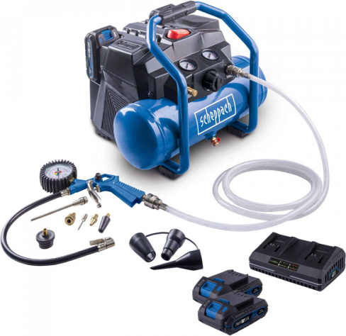 | Jaudīgs bezvadu kompresors – ideāli piemērots mobilai lietošanai un darbam mājās, darbnīcā vai garāžā. Izmēri P x A x G: 410 x 333 x 325 mm Darba spiediens max.: 8 bar Tvertnes tilpums: 6 l Ieplūdes jauda: 130 l/min. Šļūtenes garums: 2,5 m Skaņas līmenis: 96 dB (A) Motora tips: oglīšu Akumulatora spriegums: 2x 20 V (40 V) • Bezvadu darbs ar Scheppach IXES 20 voltu sēriju – ar bezvadu kompresoru var izmantot visus šīs sistēmas akumulatorus un lādētājus. • Tvertnes tilpums: 6 litri • Lieliska jauda 2x 20 V (40 V) • Spiediena regulators un 2 spiediena mērītāji precīzai darba spiediena kontrolei • Ātrā pieslēguma sistēma ātrai instrumentu maiņai • Maksimālais darba spiediens: 8 bāri • Bezeļļas kompresors, kas nodrošina ilgu kalpošanas laiku • Gaisa ieplūdes jauda: 130 l/min • Vibrāciju absorbējošas gumijas kājiņas, lai tas neslīdētu un klusam darbam ar zemu vibrācijas līmeni • Ergonomisks un kompakts dizains ar mīkstu rokturi ērtam darbam • Ietver 11 daļu piederumu komplektu | ||||||||||||||||||||||||||||||||