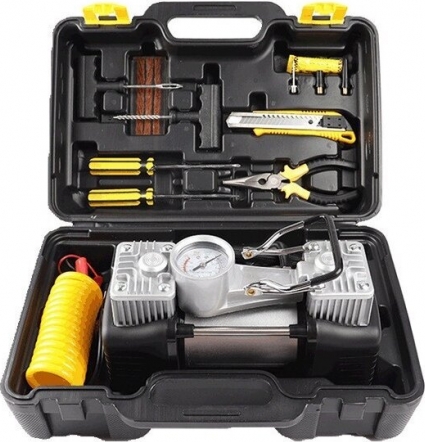 Cilindrs Ø30 mm, 2 cilindri Vads L = 3 m, 1,2 m2 0,75 m gumijas šļūtene 12 V barošana no automašīnas rozetes Strāva 20 A Maksimālā gaisa plūsma 40 L / min Rotors izgatavots no vara Darbības laiks aptuveni 15 min Ar riepu remonta instrumentiem, nazis, knaibles, divi skrūvgrieži, akumulatora adapteris Iepakojums - Plastmasas kaste |