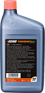 | Universāla divtaktu eļļa, kas izstrādāta tieši ECHO. Ilgstošu pētījumu rezultātā tika izstrādāta Power Blend eļļa, kas: - Ir sintētisko sajaukumu eļļa, ko var izmantot visos divtaktu ierīču dzinējos - Pārsniedz ISO-LEGD un JASO M345/FD prasības - Lieliski tīra - Samazina aizsērējumus - Pasargā no rūsas, nolietojuma un korozijas - Samazina izplūdes gāzu līmeni | ||||||||||||||||||||||||||||||||
