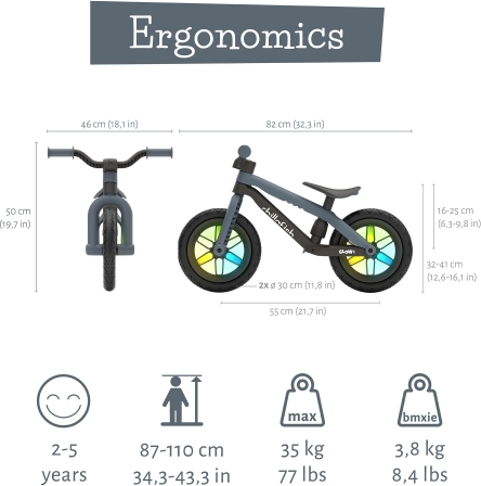 Jaunums! Chillafish BMXie 2 līdzsvara velosipēds no 2 līdz 5 gadiem ar gaismiņām! CPMX04ANT Riepās integrēti tumsā spīdoši atstarotāji! Nav nepieciešamas baterijas, brauc un spīdi! BMXie neiziet uz kompromisiem. BMXie līdzsvara velosipēdam ir BMX stila velosipēda rāmis. Neskatoties uz to, ka tam ir liela izmēra rāmis, tas ir ļoti viegls. Īpaši izstrādāts dizains, regulējams sēdeklis un kāju atbalsts, kuru nepieciešamības gadījumā var noņemt. Tas ir aprīkots arī ar numura zīmes plāksni, kuru var daudzveidot, izmantojot komplekta pieejamās uzlīmes (6 gab.). Papildus informācija: