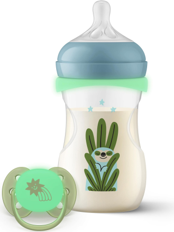 Philips Avent Natural Response Nighttime Mazuļa dāvanu komplekts Atbalsta mazuļa individuālo dzeršanas ritmu Ideāls dāvanu komplekts jūsu mazuļa barošanai un mierināšanai ar krāsu buķeti. Ar dabiskās reakcijas knupi mazuļi var dzert savā ritmā — gluži kā no krūts, kas atvieglo krūts barošanas apvienošanu ar barošanu no pudelītes. Knupis, kas darbojas kā krūts Knupis atbrīvo pienu, kad mazulis aktīvi dzer Natural Response knupītis pielāgojas mazuļa dabiskajam barošanas ritmam, nodrošinot, ka ir viegli apvienot barošanu ar krūti un barošanu ar pudelīti. Knupītim ir unikāla atvere, kas atbrīvo pienu tikai tad, kad mazulis aktīvi dzer. Līdz ar to, kad mazulis ietur pauzi, lai norītu un elpotu, arī piena padeve tiek apturēta. Dabisks satvēriens ar krūts formas knupi Plašais, mīkstais un elastīgais knupis ir paredzēts, lai imitētu krūts formu un sajūtu, palīdzot mazulim ērti ieķerties un ēst. Īstā pudelītes knupja atrašana ir ļoti svarīga Katram no mums ir savs prasmju apgūšanas temps. Arī zīšana ir prasme, un daži mazuļi apgūst to ātrāk nekā citi. Tāpēc būs zīdaiņi, kas sākotnēji labprātāk izmantos mūsu “First Flow” knupīti (knupītis 0) un tikai pēc tam varēs pāriet uz “Natural Response” knupīšiem. Izmantojiet “First Flow” knupīti, ja jūsu mazulim nepieciešamas vairāk nekā 20 minūtes, lai izdzertu 50 m ar “Natural Response” knupīšiem. Ja mazulis nevis dzer, bet rotaļājas ar knupi vai šķiet neapmierināts, izmēģiniet lielākas plūsmas knupi. Ja tomēr problēmas ar barošanu nepāriet, konsultējieties ar veselības aprūpes speciālistu. Spīd, lai barošana naktīs būtu ērtāka Tumsā spīdošais riņķis nodrošina maigu gaismu, kas palīdz barot bērnu un uzraudzīt apēstā ēdiena daudzumu tik mierīgi, cik vien tas iespējams, pat vājā apgaismojumā. Pietiekami gaismas vienai barošanas reizei Gaismas riņķim, kurš uzlādējas iekštelpu apgaismojumā vai dienasgaismā, ir vajadzīga tikai viena stunda, lai uzlādētu gaismu un būtu gatavībā nākamajai bērna barošanai. Veidots, lai samazinātu kolikas un diskomfortu Pretkoliku vārsts ir veidots tā, lai neļautu gaisam ēšanas laikā iekļūt mazuļa vēderā un samazinātu kolikas un diskomfortu. Bez noplūdes knupīša dizains novērš noplūdes un piena zudumu Knupja atvere ir veidota, lai atbrīvotu pienu tikai tad, kad mazulis ēd. Līdz ar to varat droši izvairīties no piena zuduma mājās vai ceļā. Pareizās knupja plūsmas izvēle mazulim Katrs mazulis ēd atšķirīgi, kā arī attīstās savā tempā. Esam izveidojuši dažādus plūsmas ātrumus, lai jūs varētu atrast piemērotāko jūsu mazulim un personalizēt jūsu pudelīti. Visi dabiskās reakcijas knupji ir izgatavoti no mīksta silikona. Vienkārša izmantošana un tīrīšana un ātra salikšana Platais pudelītes kakliņš padara vieglāku uzpildi un tīrīšanu. Tikai dažas detaļas ātrai un vieglai salikšanai. Viegli turēt pat mazām rokām Ergonomisko pudelīti ir viegli satvert jebkurā leņķī, lai nodrošinātu maksimālu komfortu barošanas laikā. Viegli turēt jūsu rokām un sīciņām rokām. Saderīga ar Philips Avent produktu klāstu Mainiet un pieskaņojiet mūsu piena sūkņa, pudelītes un krūzītes detaļas, izveidojiet komplektu, kas atbilst jūsu vajadzībām un lietojiet, kad nepieciešams. Natural Response knupji, kā arī pudelītes nesatur BPA* Philips Avent Natural pudelītes un knupji ir ražoti no BPA* nesaturoša materiāla. Esiet pacietīgs, kamēr mazulis pielāgojas Mūsu jaunās Natural Response zīdaiņu pudelītes atšķiras no brīvās plūsmas zīdaiņu pudelītēm. Tāpat kā ēdot no krūts, var būt nepieciešami vairāki mēģinājumi, lai to iemācītos. Tas ir pilnīgi dabiski. Īpaši mīksts knupītis jūsu mazuļa jutīgajai ādai Īpaši mīkstais, elastīgais aizsargs pielāgojas mazuļa vaigu formai, atstājot mazāk nospiedumu un izraisot mazāk ādas kairinājumu, lai komfortablāk nomierinātu.* Materiāls: Knupītis – Silikons, Nesatur BPA* Kas ir iekļauts: