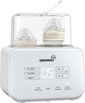 The Grownsy multifunctional bottle warmer is a practical aid for parents from the very first days of their baby's life. It combines eight functions: rapid milk warming, defrosting, keeping food warm for up to 24 hours, meal warming, steam sterilization, timer, temperature control, and a basket to protect against burns. This means you don't need to use several separate devices – you always have everything you need at your fingertips, exactly when you need it.