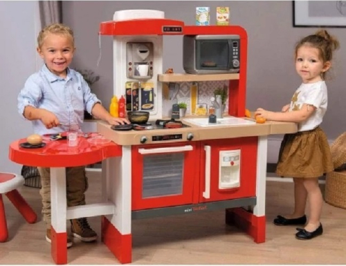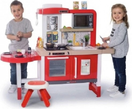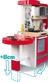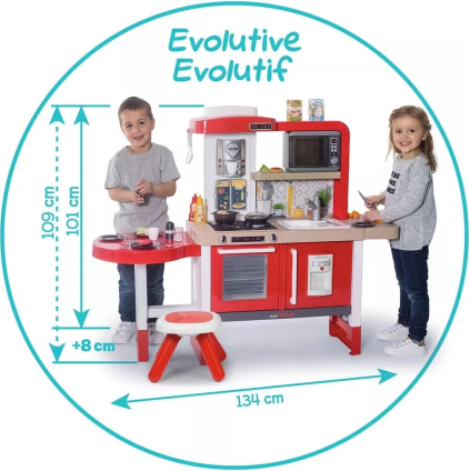 Virtuve, kas aug kopā ar jūsu bērnu! Tefal evolutive virtuve no Smoby lieliski iederēsies dažādās mājas telpās, pateicoties tās modernajam dizainam. Tās noņemamās pamatnes ļauj palielināt darba virsmas augstumu no 50 et 58 cmn, kas garantē lielisku rotaļlietojamību no 3 gadu vecuma līdz 6-8 gadu vecumam! Maģiskās funkcijas izklaidēs jūsu bērnus: elektroniskais modulis ar Magic Bubble funkciju: novietojiet katliņu uz plīts, un ūdens sāk vārīties. burkāns, ko var sagriezt karstumjutīgas makaronu mīklas, kas maina krāsu, tiklīdz tās ievieto aukstā ūdenī, un elektroniskā mikroviļņu krāsns. Šai augstas komplektācijas virtuvei ir daudz sastāvdaļu: 1 galds, 1 izlietne ar 1 funkcionālu krānu, 1 plaukts darba virsmas paplašināšanai, 1 plīts, 1 tvaika nosūcējs, 1 cepeškrāsns, 1 ledusskapis ar 1 kubiņu dozatoru, 1 plaukts, 1 espresso automāts ar kapsulām, 1 recepšu grāmata (atlokāma) un 1 elektroniskā mikroviļņu krāsns. Viss, lai jūsu bērni varētu izklaidēt bērnus garām stundām! Komplektā ir iekļauti 43 aksesuāri, lai padarītu spēles funkcijas spilgtākas: 1 kečupa pudele, 1 majonēzes pudele, 1 burkāns griešanai, burvju steiks un zivs, 1 pankūka, 5 karstumizturīgas pastas, 1 tartlete, 1 ola, 1 sāls un 1 piparu kratītājs (cric crac), 2 krūzes, 4 pelēki šķīvji, 2 glāzes, 2 dakšiņas, 2 naži, 2 karotes, 3 grilēšanas piederumi, 3 ledus gabaliņi, 3 kafijas kapsulas, 1 katls, 1 katla vāks, 1 panna pankūku apvēršanai. Pateicoties tās bagātīgajām funkcijām, evolutive virtuvei nebūs problēmu iepriecināt jūsu bērnus! Tā ļaus viņiem iztēloties daudzus gastronomiskus piedzīvojumus! Komplektā nav iekļautas 3 LR03 baterijas. Bērniem no 3 gadu vecuma - Ražots Francijā. Svars 11,7 kg Izstrādājuma izmēri: 134,0 x 44,0 x 101,0 cm (garums x platums x augstums). Vecums: no 3 gadiem līdz 8 gadiem Ražotāja kods 312302 |
