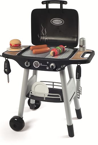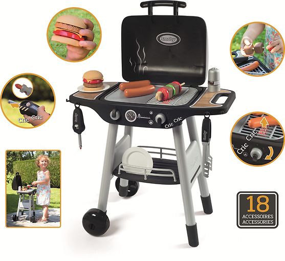 Ar šo grilu jūs varat palīdzēt saviem vecākiem gatavot! Vasaras laikapstākļos nav nekā labāka par gardu maltīšu gatavošanu visai ģimenei! Smoby BBQ Grill spēļu grilam ir režģis un čuguna grils, gluži kā īstam grilam. Tomēr uzmanieties, lai neapdedzinātu sevi, kad parādās liesmas! Tam ir 18 papildu piederumi, tostarp divi šķīvji, saliekams hamburgers, iesms, kas sastāv no gaļas gabaliņiem un dārzeņiem, divas desiņas, gāzes šķiltavas, knaibles un sāls un piparu dzirnaviņas. Izmantojot šos grila rīkus, jums ir viss, kas nepieciešams īstam grila šefpavāram! Ar rotaļu grilu jūsu bērns var attīstīt savas motoriskās prasmes.