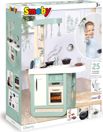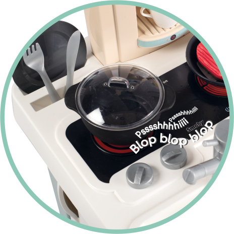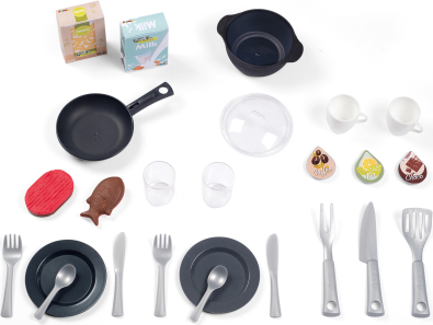 25 accessories are included to enhance the play functions: 3 barbecue utensils, 2 forks, 2 knives, 2 spoons, 2 plates, 2 glasses, 2 cups, 3 coffee capsules, 1 frying pan, 1 pot, 1 pot lid, 2 dummy boxes, 1 magic steak and 1 magic fish.