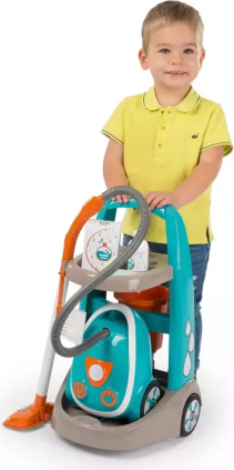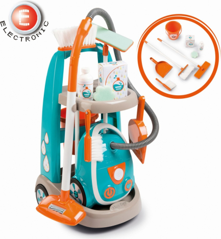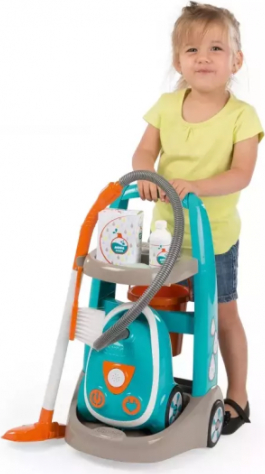 Tīrīšanas ratiņi SMOBY ar 9 piederumiem! Komplektā atradīsit: slotu, mazgājamo slotu, mažo slotu un šaufeli un citas tīrīšanai noderīgas lietas, kā arī putekļsūcēju ar īstiem sūkņa skaņas efektiem! Komplektā 3 LR44 / AG13 baterijas. Izmēri: 31 x 32,1 x 55,2 cm |