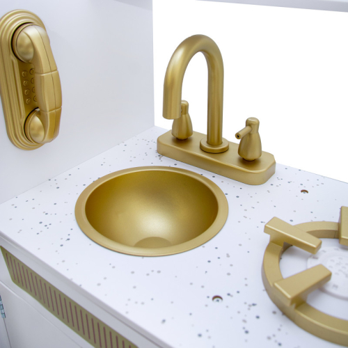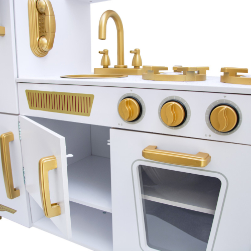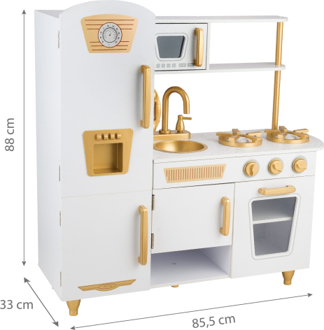Šī greznā koka virtuvīte ir sapnis katrai topošajai šefpavārei! Šī virtuvīte ar greznu zelta dekoru noteikti sagādās prieku un vienlaikus rosinās radošumu un iztēli, kā arī palīdzēs jūsu mazajam pavāram pagatavot dažādus gardus ēdienus. Oriģināla un reālistiska dizaina ierīces: izlietne, plīts, cepeškrāsns, mikroviļņu krāsns. Ļaujiet bērnam pagatavot iespaidīgus pirmos ēdienus.