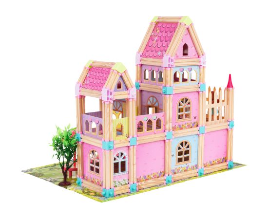 Koka, krāsainu un drošu bloku komplekts bērniem no 3 gadu vecuma. Pakete sastāv no 183 elementiem, kas, saliekot, rada koka māju ar dārzu un atpūtas zonu. Komplektā ietilpst arī 2 princeses figūras.