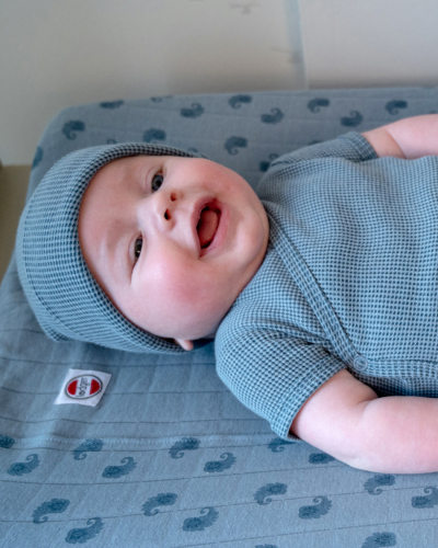 PRODUKTA APRAKSTS Mazuļu cepurīte no mīkstas un elpojošas kokvilnas Mīksta un elastīga mazuļu cepurīte no 100% kokvilnas ar Ciumbelle auduma dizainu. Pateicoties kokvilnas trikotāžai, cepurīte ir ļoti viegla un elpojoša kā arī pasargā mazuli no svīšanas. Trikotāžas cepurītēm ir Oeko-Tex sertifikāts un to sastāvā nav kaitīgu vielu. Cepurītes malu var atlocīt, tādējādi jūsu mazulis var valkāt cepurīti divējādi. Lieliska kokvilnas cepurīte jaundzimušajiem Jūs varat izmantot cepurīti no pirmajām dienām. Gara izmēra cepurītes modelis labi pieguļ un nodrošina jaudzimušajam siltumu. Pateicoties bezšuvju dizainam mazulis jutīsies ļoti ērti. Elastīgā kokvilna ļauj izmantot cepurīti 6 mēnešus. Kombinējiet cepurīti ar Ciumbelle bodiju un čībiņām – jauka dāvana raudzībās!