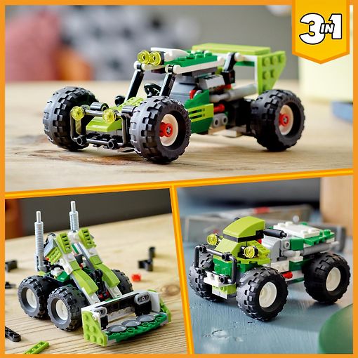 - “Trīs vienā” rotaļlieta. Bērni var izbaudīt iztēles bagātas rotaļas ar LEGO® Creator 3in1 komplektu "Bezceļu bagijs" (31123), kurā iekļauti 3 modeļi: bagijs, iekrāvējs un visurgājējs
