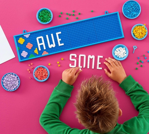 - Parādi savu vēstījumu vai dizainu. Pievienojot komplektu 41950 "Daudz, daudz DOTS: burti" (jāiegādājas atsevišķi) vai jebkuru citu LEGO® komplektu, ar kuru var pielāgot ziņojumu dēli, bērni vēl vairāk pilnveidos savas dizaina prasmes