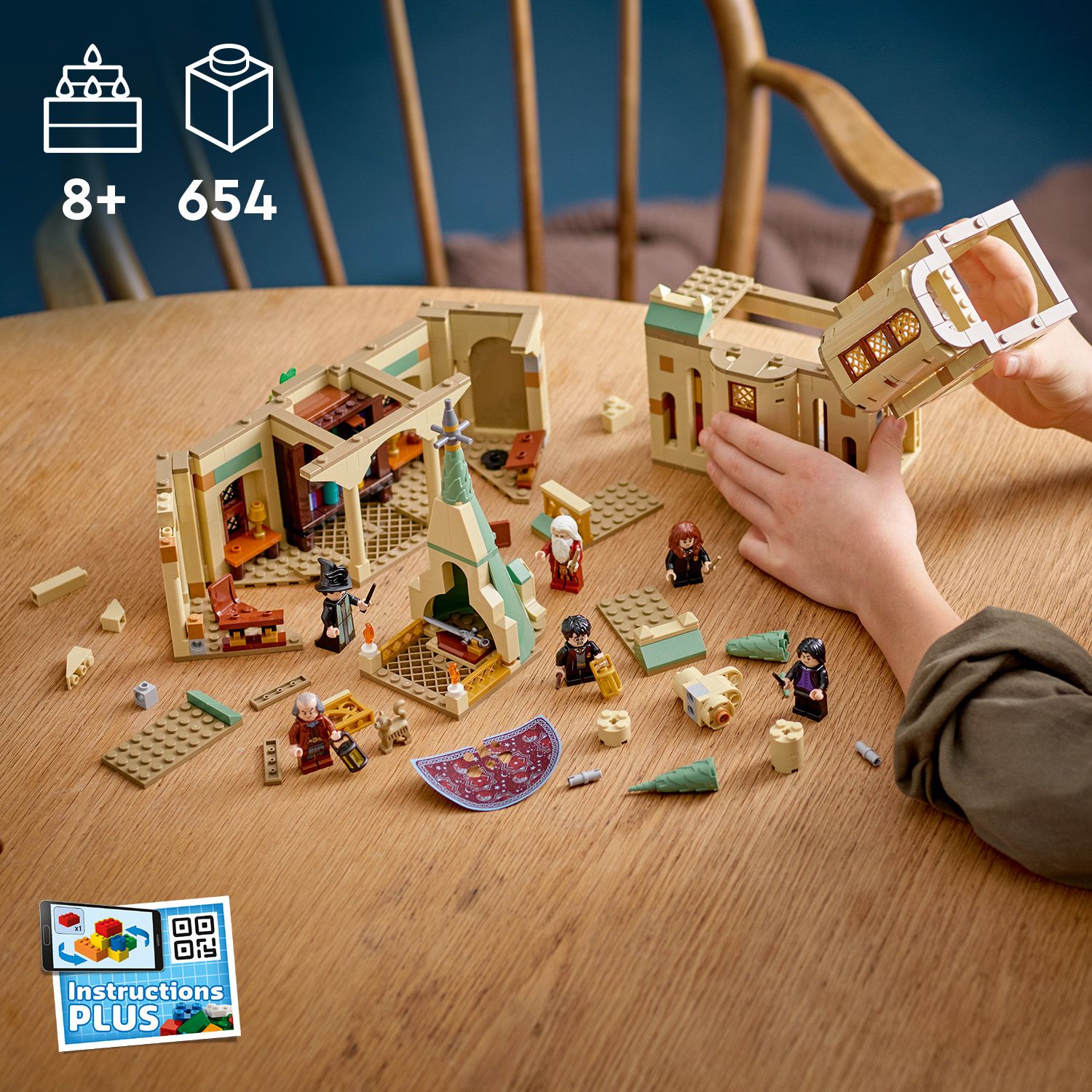 Šajā Cūkkārpas rotaļu komplektā ar vairākiem stāviem ir dažādas vietas, kas iedvesmos radošām rotaļām, un katrā no tām atradīsi autentiskas detaļas no populārajām filmām. Komplektā ir iekļautas 6 minifigūras: Harijs Poters, Hermione Grendžera, Baltuss Dumidors, Severuss Strups, Arguss Filčs un Pinsa madāma. Te ir arī pazīstami priekšmeti, tostarp Harija Paslēpnis, atmiņu glabātāja Domnīca, leģendārais Grifidora zobens, Šķirmice un mazais Fokss, kas pieceļas no pelniem. Bezmaksas lietotnē LEGO Building Instructions bērni var būvēšanas laikā modeli apskatīt, tuvināt un pagriezt, lai būvēšanas process būtu patiešām aizraujošs un interaktīvs. Šo modulāro komplektu var savienot ar citiem sērijas komplektiem, lai izveidotu visu Cūkkārpas pili.