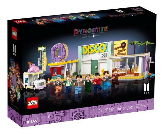 Notver priekpilno enerģiju, kas piemīt 21. gadsimta popa ikonām — RM, Jin, SUGA, j-hope, Jimin, V un Jung Kook — ar LEGO® Ideas BTS Dynamite (21339) mūzikas video komplektu. Tver būvēšanas prieku, lai atveidotu krāšņās ainas no platīna statusu sasniegušā singla “Dynamite” video. Izmanto disko, ierakstu veikalu, virtuļu veikalu, saldējuma busiņu un citus elementus LEGO klucīšu veidolā. Pievieno grupas dalībnieku LEGO minifigūras dažādās vietās vai uzliec viņus visus vienuviet uz skatuves, un pagriez ratu, lai redzētu viņus dejojam.
