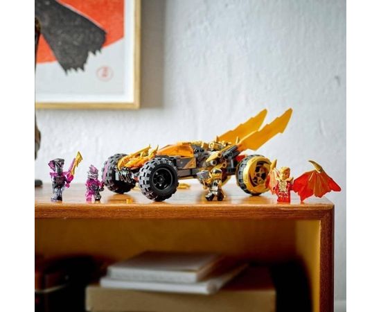 - NINJAGO® transportlīdzeklis. Kreiserim ir 4 lieli riteņi, zelta krāsas zibens asmeņi, kurus var pabīdīt uz priekšu zelta pūķa uzbrukuma režīmā, 2 šautenes un vietas minifigūrām