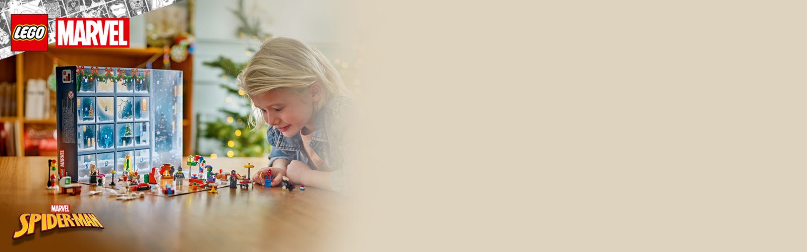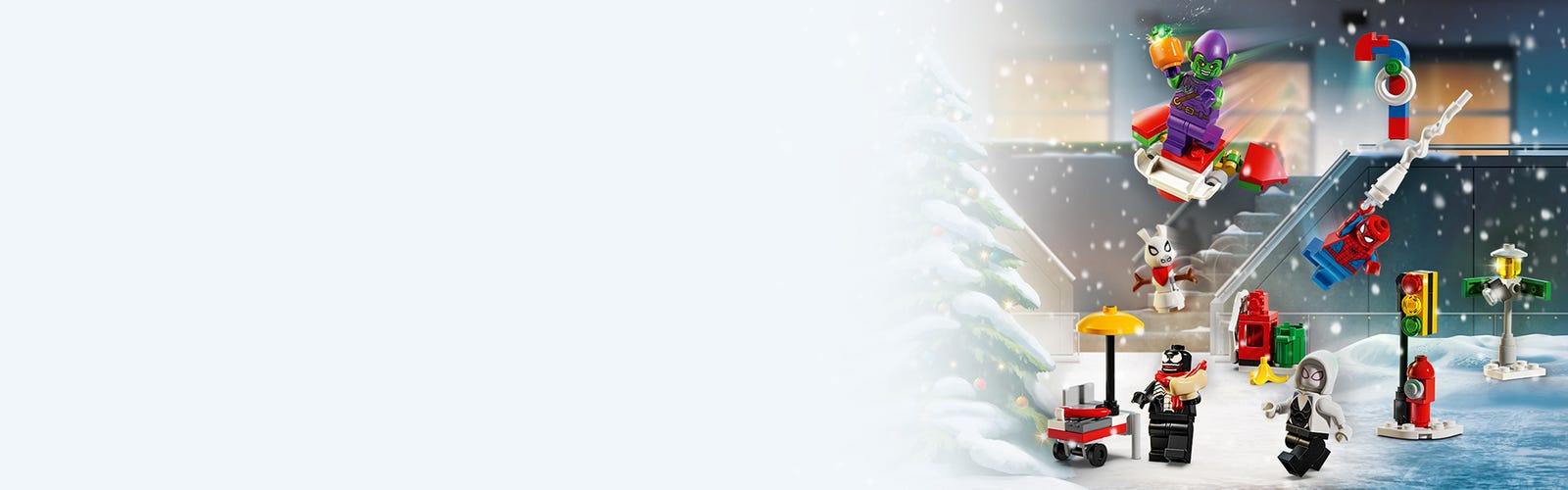 Aiz katrām no 24 durtiņām ir pa dāvaniņai bērniem, kuras atklāt, tuvojoties Ziemassvētkiem. Ir 5 minifigūras – Zirnekļcilvēks, Zaļais goblins, Miles Morales, Ghost-Spider un Venom – kā arī mazas būvējamas rotaļlietas un piederumi, ko bērni atpazīs no Ņujorkas ielu ainām Zirnekļcilvēka filmās. Tās ietver sniegotu Spider-Ham, Pītera Pārkera rakstāmgaldu un Electro ziemas koku. Ir arī 2 nelieli auto, ar kuriem var sacensties savā starpā, un Sandman katapultas dāvaniņas! Kad pienākusi lielā diena, bērni var apvienot dāvaniņas un radīt paši savus radošos, iztēles pilnos piedzīvojumus.