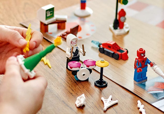 - Minifigūras un daudz kas cits. Iekļautas Zirnekļcilvēka, Zaļā goblina, Miles Morales un Venom minifigūras, kā arī 2 nelieli auto, Sandman katapulta un citas aizraujošas dāvanas