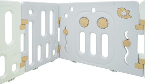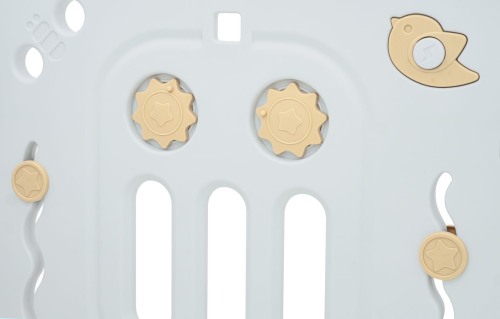 RoGer Modulara Bērnu Rotaļu Manēža Hipcio B ir plašs un stabils bērnu rotaļu būris bērniem no 6 mēnešiem, kuru var veidot dažādos formātos pateicoties 10 modulāriem paneļiem, ar pret‑slīdes kājiņām, bloķējamu durvju paneli un iekšējiem interaktīviem elementiem (pagriežamas zobrati, riteņi, svilpe, stūre), komplektā loptu turētājs un 40 mīkstas bumbas aktīvai spēlei. Rotaļu būris ir izgatavots no izturīgiem, netoksiskiem materiāliem ar gludām malām un nodrošina pietiekami daudz vietas bērna kustībām , izmēri aptuveni 128 × 150 × 63 cm. |