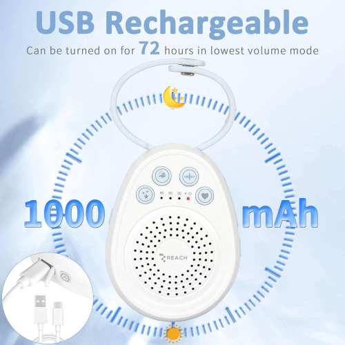 White Noise Machine Reach N-01 helps you relax and fall asleep faster. It emits various sounds, masks environmental noise, and creates a calm atmosphere. The device is especially useful for children but also suitable for adults – for sleep, relaxation, or concentration.