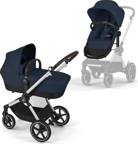 CYBEX EOS Lux kombinēto ratu unikālā pārsega/sēdekļa kombinācija 2-in-1 pielāgojas bērna attīstības posmiem, sākot no jaundzimušā līdz pat pirmsskolas vecuma bērnam. Ratiņu karkasam piestiprināto sēdekli var nomainīt no ratiņu kabīnes uz sēdekli un atkal atzveltni, tikai nomainot tekstila detaļas. Tas atvieglo dažādu daļu glabāšanu un apstrādi dažādos bērna augšanas posmos. Zem vieglā alumīnija rāmja braucienu paātrina lielas, necaurduramas visurgājējas riepas, kas piemērotas arī nelīdzenam reljefam uz neklāta seguma. Priekšējām riepām ir arī fiksējams 360 pagriezienu darbības rādiuss, kā arī atsevišķa piekare, lai mīkstinātu gaitu. Riteņa pozīcijā sēdekļa leņķi var ērti mainīt no sēdēšanas ar vienu roku uz vairāk guļus stāvokli snaudām. Sēdeklīti var arī pilnībā pagriezt uz aizmuguri vērstā virzienā, lai vecāks varētu aktīvi uzraudzīt mazo ceļojuma laikā. Liela XXL nojume ar sieta logiem ar ventilācijas atverēm, lai uzlabotu gaisa cirkulāciju, aizsargā bērnu no saules un kaitīgajiem UV stariem. Polsterētā 5 punktu drošības josta un skaisti ādas raksta drošības stienis nodrošina, ka bērns ir droši jebkurā situācijā. Rāmim ir arī ietilpīgs iepirkumu grozs kopšanas aprīkojumam vai iepirkšanās iespējām. Unikālie CYBEX EOS Lux kombinētie ratiņi, kas no ratiņiem pārvēršas par ratiņiem, ir piemēroti jaundzimušam bērnam. Pēc tam, kad bērns izaug no ratiem, ir ērti mainīt auduma daļas CYBEX EOS Lux kombinētie rati ir piemēroti lietošanai no dzimšanas līdz aptuveni četru gadu vecumam. Pārdošanas komplektā ietilpst rāmis, riepas, 2-in-1 sēdeklis/kapucis, drošības stienis, kravas grozs un XXL nojume. Rāmis