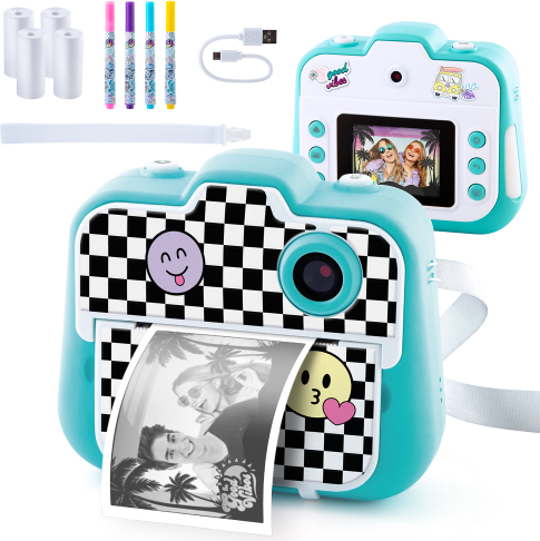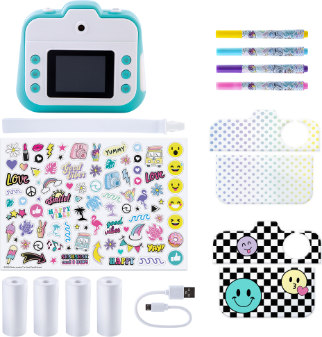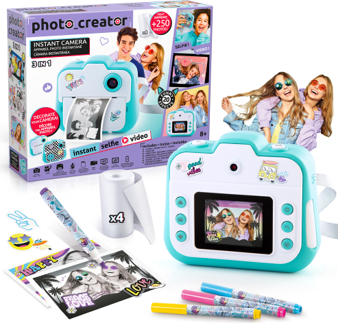 | Ar šo kameru var stundām ilgi izklaidēties un radoši darboties. Uzņem videoklipus vai fotoattēlus. Pievieno jautrus efektus un uzreiz izdrukā fotoattēlus! Tu vari pielāgot ar marķieriem un uzlīmēm! Izdrukā vairāk nekā 250 fotoattēlu! Pielāgo savu kameru ar 2 unikāliem dizaina paraugiem! Priekšējais un aizmugurējais dubultais objektīvs. 22 kadri, 4 filtri, sērijveida uzņemšana un uzņemšana taimera režīmā. Iekļauta arī video funkcija. Izšķirtspēja: 12 megapikseļi / Druka: 200 Dpi / 2,4" krāsu ekrāns / Uzglabāšanas datu nesējs: MicroSD karte (nav iekļauta komplektā). Momentfoto var izdrukāt uzreiz, neievietojot kamerā MicroSD karti. Termopapīrs bez BPA. | ||||||||||||||||||||