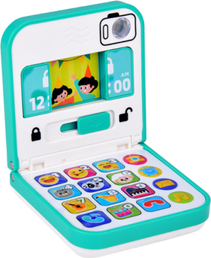 Rotaļlieta ir angļu valodā, uz aizmugurējā vāciņa ir spogulis, uz taustiņiem lielas ikonas, viegli nospiežama.Tālruņa izmēri: