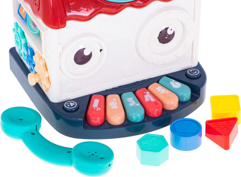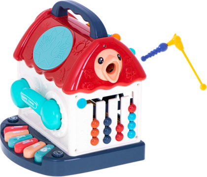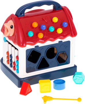 Rotaļlietai ir vairākas interesantas funkcijas. Katra siena nodrošinās dažādas atrakcijas. Starp izklaidēm būs šķirotājs, kas palīdzēs jūsu bērnam iemācīties atšķirt formas un salīdzināt tās savā starpā. Tieši virs šķirotāja ir tārpi ar magnētiskām galvām. Tos var izvilkt, izmantojot speciālu kociņu – dzeni. Tā knābja gals ir arī magnētisks, ļaujot noķert tārpus. Kad tie ir izvilkti no caurumiem, varat tos pabarot putnam, kas gaida vienā no jumta sienām. Tārpu izvilkšana var nebūt tik viegls uzdevums, kā varētu domāt! Tas prasīs lielu precizitāti, tāpēc tas ļoti ietekmēs mazuļa pacietības un roku prasmju attīstību, jo īpaši, pozitīvi attīstot viņa smalko motoriku un acu-acu koordināciju. Kad cālis ir pabarots, ir īstais laiks pāriet uz rotaļlietas nākamo pusi! Pulkstenis uz jumta palīdzēs izprast laika skaitīšanas principus, un apakšā esošais abacis iemācīs bērnu skaitīt. Bloķējošie zobrati veicinās griešanos un izskaidros, kā zobrati darbojas! Rotaļlietas pretējā pusē ir loģiskā puzle, kas ietver daudzkrāsainu bumbiņu sakārtošanu kolonnās tā, lai vienā no tām būtu tikai tādas pašas krāsas pogas. Pēdējā no rotaļlietu sienām ir mācāmās klavieres. Katrs nospiestais taustiņš radīs citu skaņu. Tas stimulē un attīsta dzirdi.