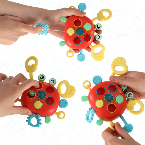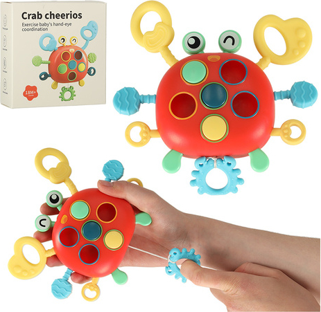 Silikona krabja kājiņas ir ideāli piemērotas , kad mazulim sāks nākt zobiņi. Zobgrauznis ietekmēs arī pareizu sakodiena attīstību un trenēs mutes muskuļus. Silikona spīļu dažādās faktūras ir lieliski piemērotas taustes sajūtas stimulēšanai. Un rotaļlietas spilgtās un daudzveidīgās krāsas piesaistīs mazuļa uzmanību un stimulēs viņa redzi. Stīgu vilkšana un pogas nospiešana garantē bērna manuālo prasmju attīstību ļoti patīkamā veidā – rotaļājoties.