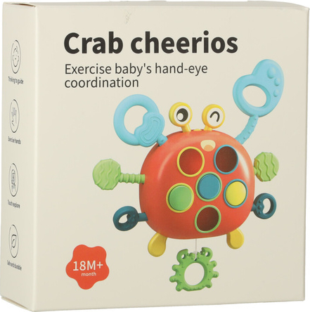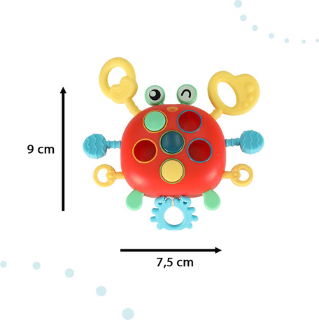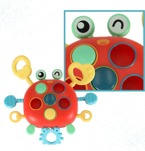 Rotaļlietai ir trīs silikona aukliņas, kuras var savīt un pavilkt no vienas puses uz otru. Uz krabja ķermeņa ir pogas, kuras var spiest. Un, ja jūsu bērns velk auklu, krabja acis sāks kustēties! Mīlīgo krabi var pakārināt dažādās vietās – gultā, mašīnā un ratos. Pateicoties tam, jūsu mazulim vienmēr blakus būs viņa mīļākā rotaļlieta!