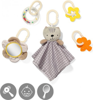 Mazulis var gulēt uz paklājiņa un vērot apkārtējo pasauli jau no pirmajām dzīves nedēļām. Pateicoties tādiem sensora elementiem kā pīkstulis, auklas vai birkas, kas paslēptas uz paklājiņa, guļot uz vēdera viņam būs interesanta spēle. Attīstošajam paklājiņam ir 5 dažādi piekariņi mazuļa attīstības atbalstam: pīkstulis, 2 zobgraužņi, grabulītis un spogulis. Rotaļlietas var piestiprināt pie arkām jebkurā secībā. Tās palīdzēs bērnam trenēt rokas prasmes – satvert un pārvietot priekšmetus.