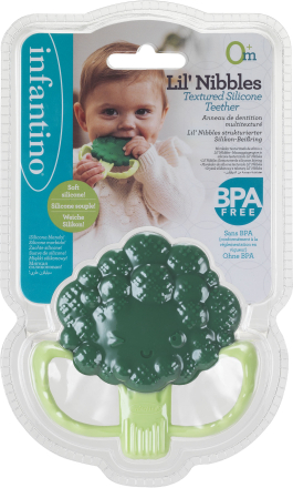 Jūsu mazulim patiks Infantino Lil Nibbles teksturētā silikona košļājamā rotaļlieta brokoļa formā. Tā ir izgatavota no droša, BPA nesaturoša silikona, kas maigi masē smaganas un palīdz zobu šķilšanās laikā. Dažādie reljefi stimulē maņu attīstību, un rotaļlieta ir viegla un ērta mazām rociņām. Viegli tīrāma un piemērota lietošanai ceļā. | ||||||||||||||||||||