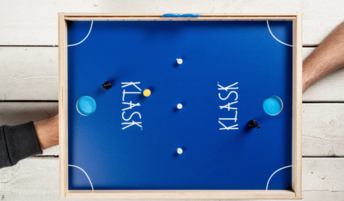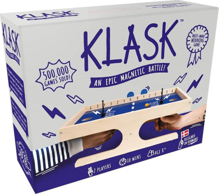 KLASK ir ātra un aizraujoša galda spēle diviem spēlētājiem. Katrs spēlētājs vada savu figūru ar magnētu zem galda virsmas, cenšoties iemest bumbiņu pretinieka vārtos un izvairīties no kļūdām. Spēle ir viegli apgūstama, taču prasa veiklību un precizitāti. Tehniskās specifikācijas: