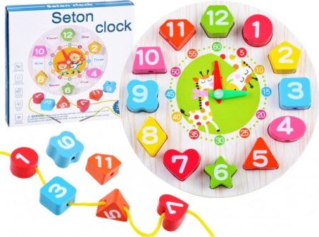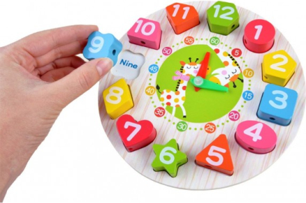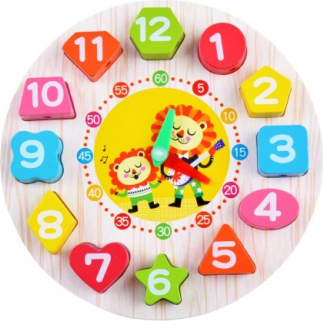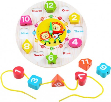 Bērnam ir ļoti svarīgi iemācīties saprast laiku/pulksteni. Šis koka pulkstenis tam ir lieliski piemērots, krāsas, raksti, kas uzzīmēti uz ciparnīcas un figūrām, iedrošinās ikvienu mazo rotaļāties. Un papildus pluss ir tas, ka figūriņas var savērt uz diega un sakārtot kārtībā. |