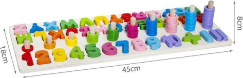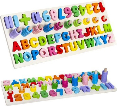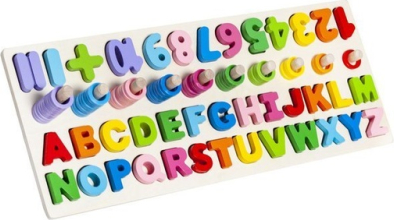 Komplektā: burtu komplekts (alfabēts), ciparu komplekts (1-10), matemātiskās zīmes, plastmasas riņķi, koka pamatne.