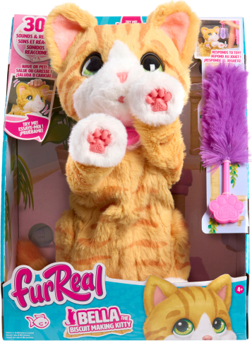 Ar interaktīvo plīša rotaļlietu "furReal Bella the Biscuit-Making Kitty" bērni jutīsies mīlēti un apmīļoti! Šis īpaši mīkstais, oranži-baltais kaķēns ir ne tikai mīlīgs, bet arī pilns ar mīlestību un gatavs spēlēties. Paglaudi Bellu pa galviņu, lai viņa sāktu smieties, ņaudēt, murrāt un veikt mīcīšanas kustības. Pamāj viņai ar pūkaino, violetās krāsas rotaļlietu – Bella nostāsies uz pakaļkājām un centīsies to aizsniegt. Kad pienāk mīļošanās brīdis, paņem Bellu klēpī. Paturi galviņas sensoru 5 sekundes, un viņa veiks mīcīšanas kustības veselas 30 sekundes – gluži kā laimīgi kaķi dara. Bella uzvedas ļoti reālistiski – tikai bez asiem nadziņiem! Bērniem patiks rūpēties par šo burvīgo, strīpaino kaķenīti. | ||||||||||||||||||||
