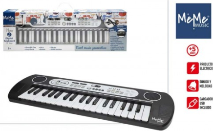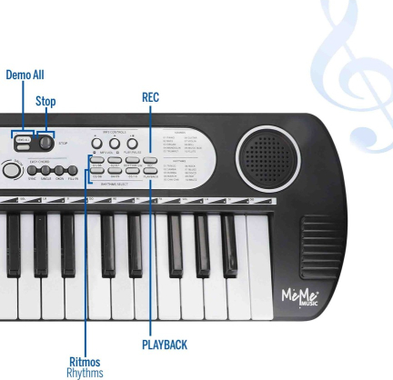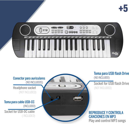 Tajā ir iekļautas arī skaņas, ritmi, melodijas, sustain un vibrato efekti un daudz kas cits, lai jums nebūtu garlaicīgi! To darbina 4 AA baterijas (nav iekļautas komplektā), un tam ir ports USB-DC kabelim (nav iekļauts komplektā) vai strāvas adapterim (nav iekļauts komplektā), austiņu ligzda (nav iekļauta komplektā) un USB ports zibatmiņas diskam (nav iekļauts komplektā). Ideāli piemērots sensorās uztveres un muzikālās radošuma stimulēšanai mazajiem — jautra un izglītojoša spēle vienā instrumentā! Iemācieties spēlēt dziesmas ar šo fantastisko 37 taustiņu MeMe Music elektronisko klaviatūru! Tās izmēri ir 54x17 cm, un tai ir austiņu ligzda (nav iekļauta komplektā), USB-DC kabeļa ligzda (nav iekļauta komplektā) vai strāvas adaptera ligzda (nav iekļauta komplektā), kā arī USB zibatmiņas diska ligzda (nav iekļauta komplektā). Funkcijas: skaļuma un tempa vadība, ierakstīšana un atskaņošana, ieslēgšanas/izslēgšanas, ierakstīšanas, apturēšanas, atskaņošanas un aizpildīšanas pogas, MP3 vadība, OKON mācīšanās funkcija un demonstrācijas, ritma un skaņas selektors. Darbojas ar 4 AA baterijām (nav iekļautas komplektā). Skaņas, melodijas un efekti: 10 skaņa, 10 ritmi, 6 iepriekš ierakstīti skaņdarbi, 37 perkusiju skaņas, akordi, kā arī sustain un vibrato efekti. Vērtības: Pārnēsājama klaviatūra, kas veicina sensoru stimulāciju un attīsta roku veiklību, roku-acu koordināciju un radošumu. Rotaļlieta-sintezators. Barošanas avoti: USB (VDC=5V, I=500mA) vai 4 "AA"(4x1,5V) baterijām (kompl. neietilpst). BRĪDINĀJUMI! Nav piemērots bērniem, kas jaunāki par 36 mēn! Nelietot tuvu pie auss! Izmantot tikai pastavīgā pieaugušo uzraudzībā! Nepareiza lietošana var radīt dzirdes traucējumus! Komplektā sīkas detaļas! Savainošanās risks! Nepieļaujiet lai bērns piekļūtu baterijām! Pirms rotaļlietu dodiet bērniem izņemiet to no iepakojuma. Ja uz tā ir svarīga informācija noglabājiet to bērniem nepieejamā vietā! Ražots Ķīnā. Importētājs: Colorbaby. S.L. Calle Cordoba 15. Pol. Ind. Altac I Aptdo. Correos 40, 03440 Ibi, Alicante, Spain, e-mail: info@colorbaby.es