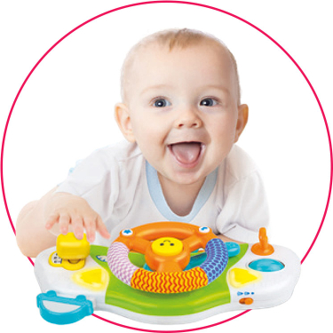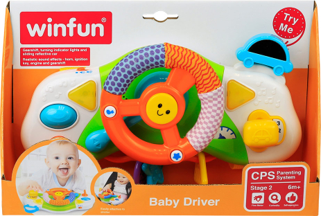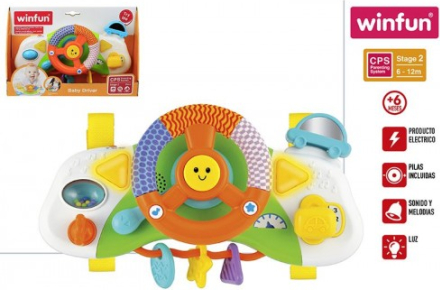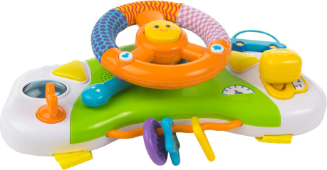 - muzikālias spēļu centrs "Ritenis" - Rotaļlieta sastāv no: stūres rata ar krāsaina auduma oderi, raga, pārnesuma, aizdedzes atslēgas, pagrieziena rādītājiem, piltuvēm un bumbiņu komplekta. - Rotaļlieta ir piestiprināta ar divām siksnām - Spilgtai un smieklīgai rotaļlietai ir dažādas faktūras un formas, kas veicina mazuļa sajūtu attīstību. - Ieteicams no 6 mēnešiem. - Izmēri: 32 x 20 x 10 cm. |