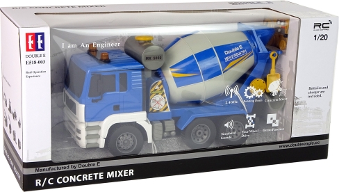 Concrete Truck Remote Controlled Blue 2.4G Rotating Pear Truck The concrete mixer has a lot of advantages. The remote control function, high quality workmanship and realistic design will bring great pleasure to any child. The construction of the toy includes movable elements, such as a detachable shovel or rotating pear and spout, which encourage play and improve children's hand-eye coordination. The remote-controlled children's construction vehicle is set on treaded rubberised wheels that will allow play on a variety of surfaces. The blue concrete mixer is decorated with contrasting white and grey details, as well as distinctive stickers. The front of the cab and the roof feature lights, imitating real headlights. A 2.4G remote control is included, which adds a great deal to the level of fun. With its help, the concrete mixer operator can steer the mixer, changing the forward/reverse and right/left directions, as well as rotating the concrete mixing bucket. The Mercedes remote-controlled concrete mixer has been made from the highest quality materials. The design of the toy puts children's safety first, so it is free of sharp parts.