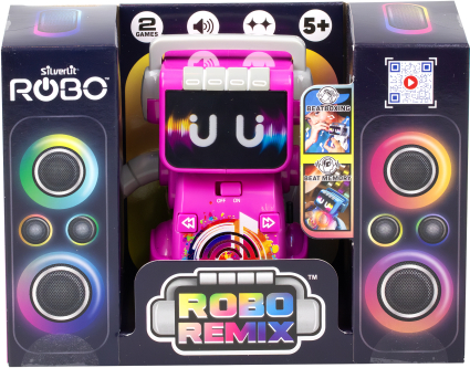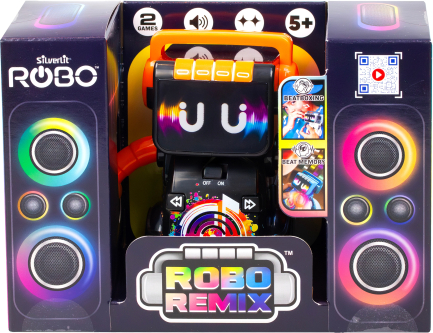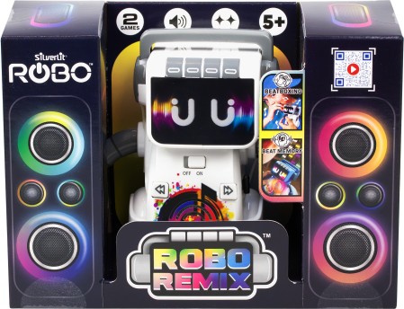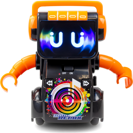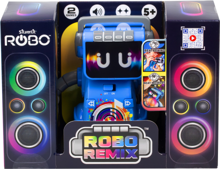 | ROBO REMIX apvieno mūziku, kustību un interaktīvu jautrību – ar mirdzošu seju un ritmiskām kustībām šis robots dejo piecu iebūvētu skaņdarbu pavadībā. Izmēģini divas aizraujošas spēles: izveido savus ritmus ar dažādiem skaņu efektiem vai atkārto robota parādīto ritmu, lai apgūtu visus piecus līmeņus. Vari miksēt, atcerēties vai vienkārši skatīties, kā ROBO REMIX dejo! | ||||||||||||||||||||