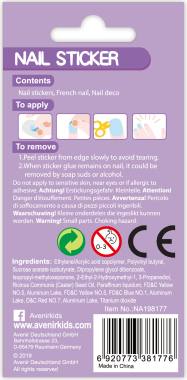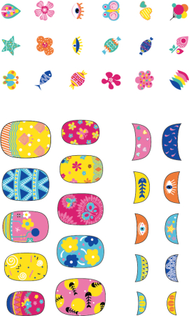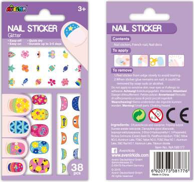 | 38 mirdzošu ziedu tematikas nagu uzlīmju iepakojums. Viegli uzliekamas un noņemamas, ātri žūst. Noturīgas līdz 3-5 dienām. Ieteicamais vecums: 3+. Izmēri (platums x augstums x dziļums): 13 cm x 17 cm x 0,5 cm. | ||||||||||||||||||||