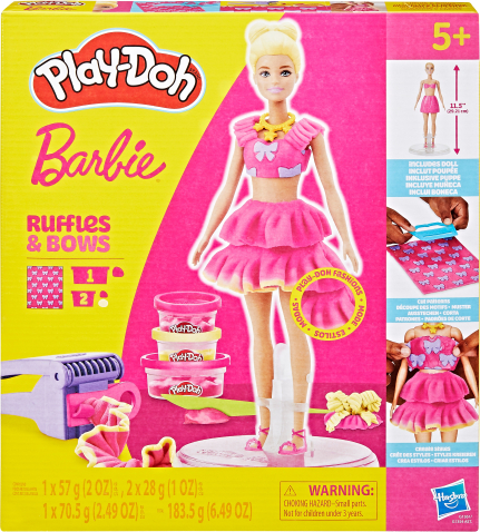 | Radi supermīlīgus tērpus ar Ruffles and Bows komplektu! Ar šo mākslas un rokdarbu komplektu ir viegli un jautri veidot Play-Doh Barbie lelles apģērbus. Vienkārši novieto lelli uz statīva, izmanto Play-Doh rakstu lapu un griezējus, lai izveidotu kleitas, un saģērb Barbie visradošākajos veidos, kādus vien vari iedomāties. Piešķir lellei dažādas Play-Doh frizūras ar matu veidni vai arī izveido savus matus ar rokām. Pievieno Barbie aksesuārus, piemēram, somiņu un kurpes, lai pabeigtu izskatu. Turpini radošo spēli ar 2 Play-Doh trauciņiem, lai pievienotu vēl vairāk detaļu. Tā ir fantastiski stilīga dāvana bērniem, kuriem patīk Barbie komplekti un Play-Doh rotaļlietas! | ||||||||||||||||||||