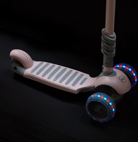 Platais aizmugurējais ritenis palielina braukšanas stabilitāti, un regulējamais stūres augstums ļaus pielāgot pareizo augstumu bērna vajadzībām. Gan priekšējiem, gan aizmugurējiem riteņiem ir iebūvēti LED gaismas, kas sniedz daudz prieka un arī padara bērnu redzamāku braukšanas laikā.