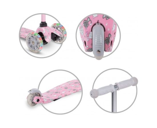 Materiāli: alumīnija stūre, plastmasas platforma, poliuretāna riteņi ar LED apgaismojumu.