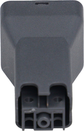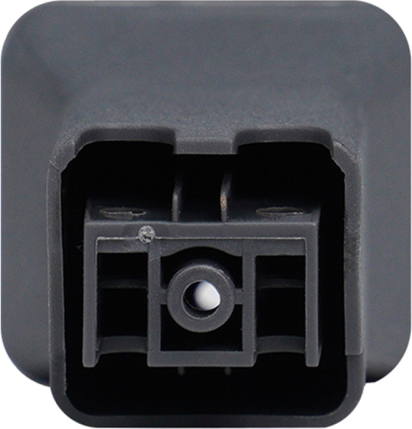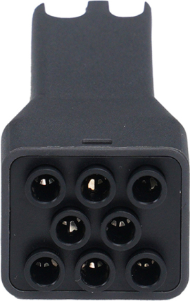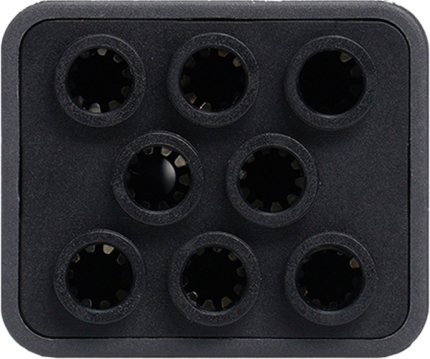 A black, square connector with eight round contact holes, shown in close-up against a light background.