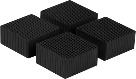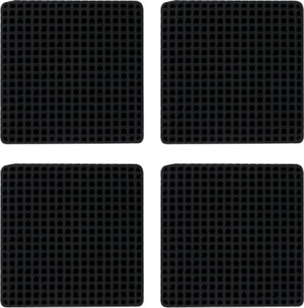 Four black activated carbon filters with a dense mesh of small holes, arranged side by side on a light background.